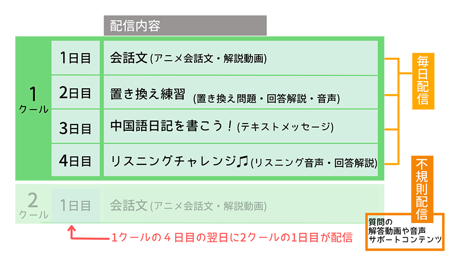 時間ができた時にその分を取り戻していただければと思います。ですが、毎日継続して中国語に触れるということが大事なので、なるべく1日の中でスキマ時間を見つけて、1分でも2分でも結構ですので、中国語に触れることを意識してみてください。もし学習できない期間が長引いてしまった場合は配信を戻すことも可能です。